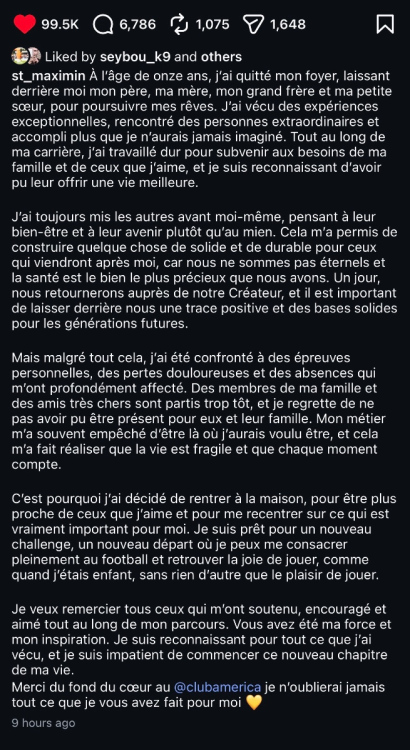 Jerem Coco Posté(e) il y a 1 heure Posté(e) il y a 1 heure il y a 2 minutes, karldu91 a dit : L’article ne parle pas de durée de contrat 🤔 La seule référence à « 6 mois » est en rapport à son expérience mexicaine : « C’est un retour qui va faire du bruit ! Après avoir annoncé son départ du Club América, six mois après avoir rejoint Mexico, Allan Saint-Maximin est sur le point de revenir en France » À 28 ans, il a marqué 3 buts en 16 matchs de championnat cette saison. Lens, leader provisoire de Ligue 1, en attendant le résultat du PSG à Strasbourg ce dimanche soir, réalise un très joli coup en s’attachant les services de l’ancien Niçois pour les six prochains mois. La fin de l'article dit 6 mois, bizarre Citer